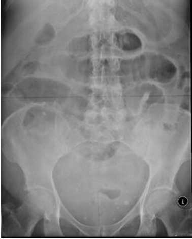 A 73-year-old woman with no prior surgical history presented to the emergency department with a four-day history of abdominal distension, bilious vomiting and not opening her bowels. On physical examination her abdomen was markedly distended, but soft, non-tender with tinkling bowel sounds. Rectal examination revealed no abnormalities. Laboratory findings showed raised inflammatory markers: CRP 123 mg/l and plain film radiography revealed dilated small bowel loops (Figure 1). A CT scan of abdomen and pelvis was subsequently performed which showed dilated small bowel with a transition point in the distal ileum with no definite cause of obstruction identified. Initially, she was managed conservatively with nasogastric tube decompression, intravenous antibiotics and fluids with little improvement of her symptoms. Therefore a diagnostic laparoscopy was undertaken. Intraoperative findings revealed internal herniation of distal ileum through a 3x3 cm defect in the broad ligament of the uterus (Figure 2) and (Figure 3). The small bowel had no evidence of ischaemia therefore was simply reduced and the defect of the broad ligament was closed with 2–0 vicryl stitches (Figure 4). Postoperatively her symptoms completely resolved leading to her discharge after three days. | ||||||