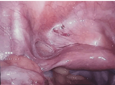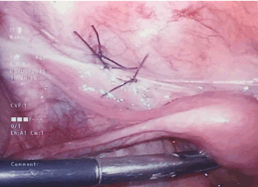 There are various types of internal hernias described in the literature; most commonly reported in 53% of cases are paraduodenal. Others examples include pericecal (13%), transmesenteric (8%), and epiploic foramen hernias (8%) [1] [2]. However, intestinal herniation through the broad ligament is the least common and only accounts for 4% of all internal hernias [4] [5]. Causes of these are either congenital or acquired in nature: usually due to obstetric trauma, abdominopelvic surgery, or pelvic inflammatory disease [5]. Therefore in a woman with a virgin abdomen and no significant medical history, a congenital cause must be considered. There are two classification systems described in literature which can be used to categorise defects within the broad ligament. The first was described by Hunt in 1934 and is based on the degree of peritoneal extension. The most common is the fenestra type, which involves both peritoneal layers, as small bowel can pass directly through this it can potentially lead to bowel strangulation. The pouch type is where only one of the two peritoneal layers is affected and may allow viscera to become trapped within parametrial tissue [6]. The second was devised in 1986 by Cilley which classified broad ligament hernias into three main categories based on the location of the defect within the broad ligament. Type 1 defects are the most common and occur in the mesometrium, which contains the greater section of the broad ligament. Type 2: interrupt the mesosalpinx and the mesovarium. Type 3: arise within the centre of the round ligament [7]. The patient in the case described above had a Type 1, fenestra broad ligament defect. Clinically and radiologically internal hernias are very difficult to diagnose and a diagnostic delay is reported to have a mortality rate of approximately 50% due to the high risk of strangulation [2][5]. Laparoscopic techniques are therefore extremely important as it allows early recognition and prompt surgical management, which includes reduction of the herniated bowel, potential resection and repair of the defect [8][9][10]. | ||||||