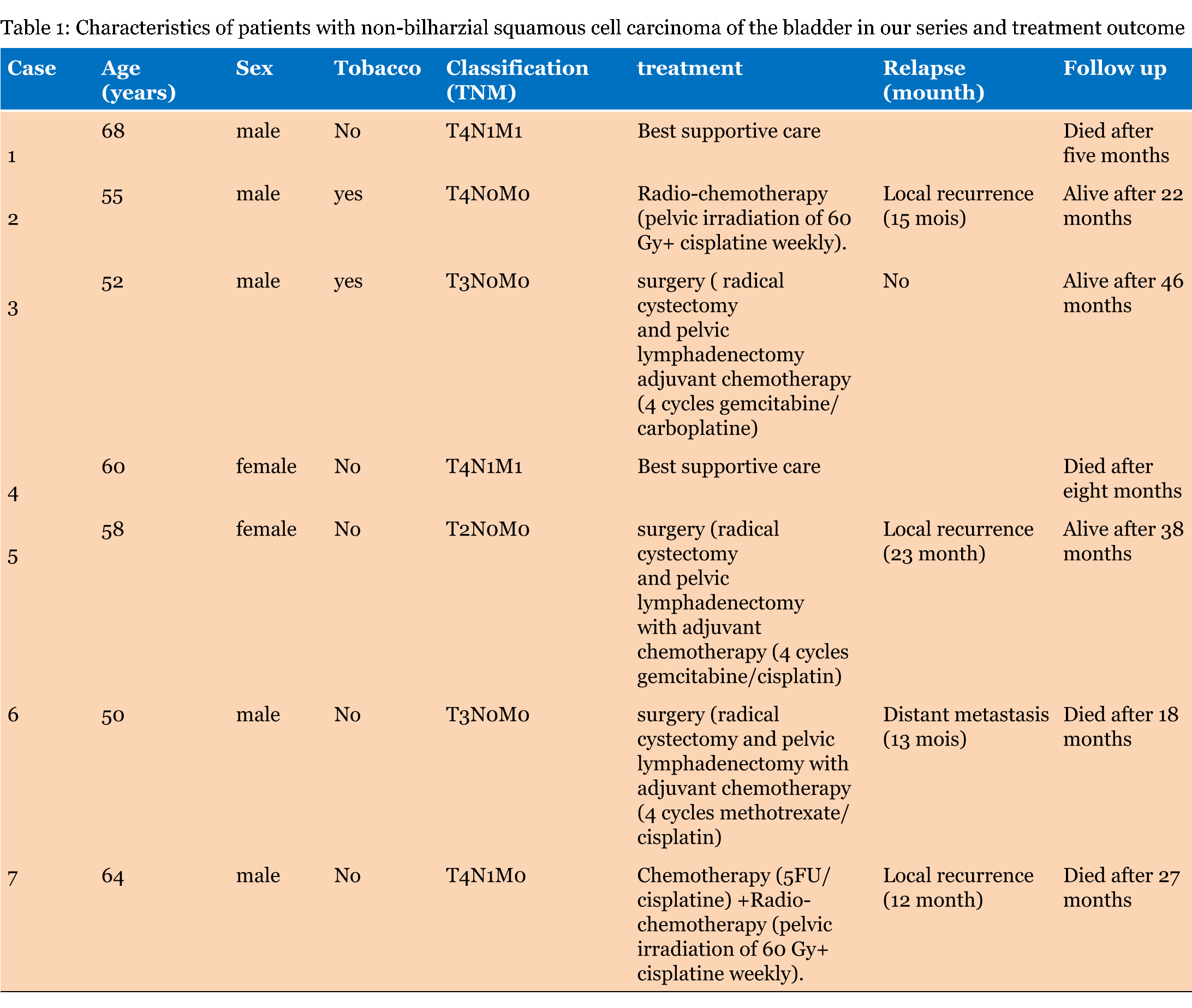 Non-bilharzial squamous cell carcinoma is the most prevalent epithelial neoplasm of the bladder after urothelial carcinoma, accounting approximately for 3–5% of bladder tumors in Western countries [1]. It is associated with chronic irritation of the bladder. In contrast to transitional cell carcinoma, NBSCC of the bladder is characterized by a lower frequency of distant metastases. The patients die usually after locoregional recurrence [1][2][3]. Due to the rarity of this entity, prospective studies are necessary to codify the optimal management of this disease. In the present study, we retrospectively reviewed our experience with non-bilharzial squamous cell carcinoma of bladder within a period of five years. | ||||||
