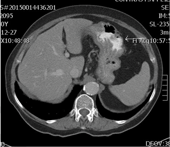 This is the case of a 79-year-old female who complained of epigastric discomfort with postprandial heaviness. She also described lower left quadrant pain and discomfort. She had no history of hematemesis, hematochezia or melena. Past medical history included breast epithelioma diagnosed at the age of 68 and collagenous colitis. Past surgical history included unilateral partial mastectomy with axillary clearance followed by adjuvant radiotherapy completed at the age of 68, bilateral total hip replacements and abdominal aortic aneurysm repair. Upon initial investigation by the patient's general practitioner, a barium swallow revealed a 5x4 cm gastric lesion with irregular contour located at the junction between the proximal third and the middle of the stomach. An upper gastrointestinal endoscopy was further performed and revealed two distinct, raised, ulcerated lesions in the stomach. A contrast-enhanced thoracic-abdominal-pelvic computed tomography (CT) scan was performed to rule out metastases. The CT scan revealed no signs of metastases (Figure 1). Biopsies obtained during endoscopy showed ulcerated gastric mucosa with fibrinous and leukocytic exudate at the surface of the lesions and a poorly differentiated malignant infiltration at deeper layers. Malignant cells with fusiform to epithelial shapes were found around the ulcer. A few foci revealed irregularly-shaped, anastomosing vascular structures lined with hyper-chromatic cells. An extensive immunohistochemical study was performed with the following antisera: cytokeratin 20, cytokeratin 17, cytokeratin AE1/AE3, CD3, CD20, CD30, Ki67, vimentin, Melan-A, CD117, CD79A, LCA, cytokeratin 5/6, EMA, GATA3, S100 protein, synaptophysin, SMA, calretinin, CD31, CD138 and CEA. The cells stained positive only for CD31, vimentin and, to a lesser extent, CD34. The expression of the cellular marker for proliferation, Ki67, was close to 100%. All lymphocyte surface markers remained negative, including the human leukocyte common antigen (LCA), which eliminated the possibility of a lymphoproliferative process. All epithelial and melanocytic markers were negative. Given that that the patient had previously been diagnosed with breast cancer, and considering the possibility of an infiltrating metastasis originating from a breast carcinoma, immunohistochemical evaluation of GATA3 expression was performed but was negative. Having ruled out the possibility of a mesothelioma or a leiomyosarcoma with a negative staining for calretinin and SMA respectively, the most probable diagnosis was a high-grade angiosarcoma of the stomach. During surgical exploration (Figure 2), many lymph nodes were noted in the mesentery of the proximal jejunum. Two gastric lesions were found in the body of the stomach (Figure 3). In addition, the involved segment of jejunum was resected and two lesions were found, very similar in appearance to the ones in the stomach. A subtotal gastrectomy with Roux-en-Y anastomosis was performed following the segmental jejunal resection. The margins of resection were 5 cm, as recommended for a gastric adenocarcinoma. Finally, immediate post-operative course was favorable and the patient has been well 2 months after operation. Close follow-up of the patient is still undergoing. | ||||||