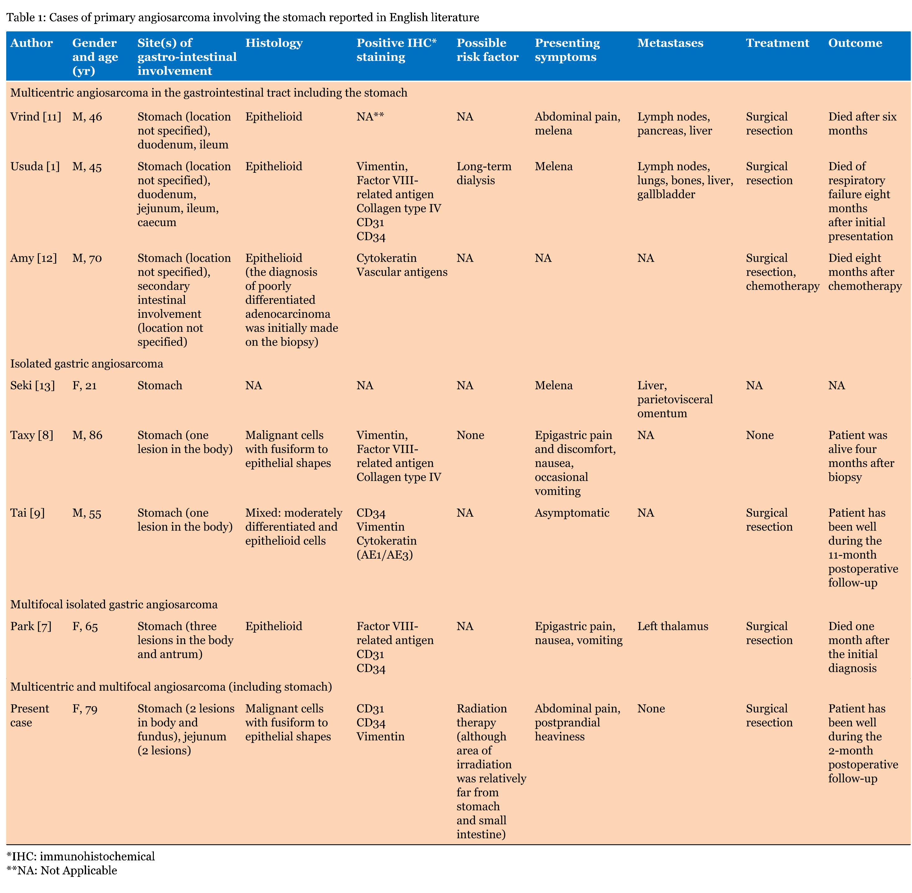 Angiosarcoma is a very rare, malignant neoplasm that is characterized by invasive anaplastic cells derived from blood vessels [2]. It accounts for less than 1% of soft tissue sarcomas. They may occur in many regions of the body, most frequently in the skin and soft tissues, and very rarely in the gastrointestinal tract [3]. Its aggressive characteristics and rarity make it an often misdiagnosed malignancy. Prognosis is usually poor and the mortality rate is high, partly due to a late diagnosis [4]. There have been only seven published cases of angiosarcoma with gastric involvement, four of which involved primary lesions (Table 1) [5] [6] [7][8][9][10]. Five patients were men and two were women. Their ages ranged from 21–86 years with a median of 55 years. Three cases were multifocal (involving the stomach and the small intestine), three cases involved a single, isolated gastric angiosarcoma and one case involved three angiosarcomas of gastric origin. Clinical manifestations included abdominal pain, nausea, vomiting and melena. One patient however was asymptomatic. Surgical resection was the most common treatment. The outcome was generally poor. Four patients died several months after diagnosis or treatment. No information was gathered regarding the longest survival period. Angiosarcoma tends to be multicentric in occurrence [1], it is sometimes difficult to distinguish between multicentricity and metastasis because of its aggressive nature,. What makes this case unique is the simultaneous presence of multicentric and multifocal primary lesions rather than metastases. The carcinogenic mechanism of angiosarcoma remains unclear. However, several risk factors associated with skin and soft tissue angiosarcomas have been documented in the past, including toxic exposure to environmental carcinogens, radiation therapy, chronic lymphedema, foreign materials and certain familial syndromes such as neurofibromatosis and BRCA1/BRCA2 mutations [2]. However, no risk factors associated to gastric angiosarcomas have been documented, with the exception of a possible association with long-term hemodialysis [1]. In the present case, the patient underwent post-mastectomy therapeutic irradiation. However, radiation-induced angiosarcomas usually occur in areas of previous radiation. Indeed, the most common sites for sarcomas in previously irradiated patients are the female breasts, followed by female genital organs [11]. Several documented cases of intestinal angiosarcoma have occurred following radiation therapy of gynaecological malignancies [1]. However, no cases ever mentioned a link between breast irradiation and angiosarcoma of gastric and intestinal involvement. Symptoms associated with gastrointestinal angiosarcoma are non-specific. As documented in previous case reports (Table 1), symptoms could include vague abdominal pain, nausea, post-prandial heaviness or melena. Gastrointestinal bleeding and anemia are usually associated with advanced disease [12]. Angiosarcoma tends to be poorly differentiated. Thus, immunohistochemical staining is a very important step in confirming the diagnosis. In this case, positive staining for CD31, CD34 and vimentin helped confirm the vascular origin of the lesions. Similar staining has been confirmed in previous case reports. Staining for factor VIII-related antigen could also be positive in angiosarcoma as reported in several previous cases [1][7][8]. In one case of an isolated gastric angiosarcoma lesion, cytokeratin (AE1/AE3) expression was present [9]. Histological evidence in previous cases demonstrated angiosarcomas epithelioid in morphology. In fact, angiosarcomas of deep soft tissues tend to be epithelioid in morphology. On the contrary, lesions in the skin and subcutaneous tissues are mostly nonepithelioid [12]. Treatment of gastric angiosarcoma consists of surgical resection. Chemotherapy and radiation therapy have been used in several cases of gastrointestinal angiosarcoma [4]. However, the role of adjuvant therapy remains unclear. Patients diagnosed with angiosarcoma with gastrointestinal involvement usually have poor prognoses. Metastases to lymph nodes and other organs are not uncommon and even expected given the aggressive nature of angiosarcomas. Indeed, many cases progress rapidly with a median survival of only two months after diagnosis[13]. | ||||||