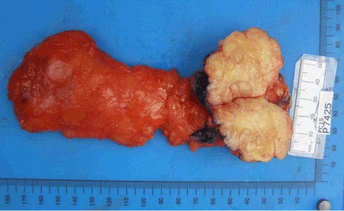 Solitary fibrous tumors are rare spindle-cell, mesenchymal tumors, which classically present as a well-circumscribed, pleural-based slow-growing masses arising from soft tissue of which there are a few variants; cellular (hemangiopericytomas), lipomatous and malignant. The lipomatous variant of solitary fibrous tumor is rare, with only approximately sixty cases reported in the English literature to date. They have a slight male predilection and occur most commonly in the fourth to fifth decade [1]. They are most common in the retroperitoneum and deep soft tissue of the lower extremity. Only six have been reported within the abdominopelvic region and this is the first report in the English literature of one located within the falciform ligament [2]. | ||||||