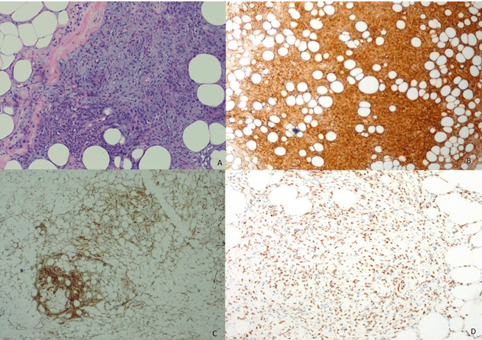 A 41-year-old male was referred to general surgery clinic with cramping epigastric pain associated with waking with an acid-like taste in his mouth. On examination, there was a palpable, hard round mass in his epigastrium. He was investigated with a full blood count, liver and kidney function tests and electrolytes; which were all within normal limits. An ultrasound scan documented a mass just below his xiphisternum, beneath his linear alba, 61x48x31 mm in size, causing mild compression of the liver. This mass was further investigated with a computed tomography scan which demonstrated a lesion reported as vascular in nature with differentials including a vascular malformation, hemangioma or vascular neoplasm (Figure 1). Intraoperatively a hard mass was identified, just below the xiphisternum, surrounded by the distal portion of the falciform ligament and completely within the peritoneal cavity. The lesion was completely excised macroscopically. The patient recovered well from the surgery and was discharged on postoperative day three (Figure 2). The patient's symptoms were most likely from gastroesophageal reflux and dysmotility of the distal esophagus found on barium swallow, as well as chronic inflammation of his esophagus and stomach, found on upper endoscopy. Histological examination showed a circumscribed, lobulated spindle cell neoplasm containing a significant amount of mature adipose tissue (Figure 3A). The spindle cells were cytologically bland and intimately admixed with the adipose tissue. The fat component exhibited atypical features and mild variability in adipocyte size, but no true lipoblasts were identified. The mitotic rate was no more than 2 per 10 high power fields (approximately 2.5 mm2). The lesion abutted the peripheral margins in multiple areas. Both the spindle cells and fat stained for S100 (Figure 3B). The spindle cells exhibited patchy staining for CD34 but were negative for SMA, desmin, CD117 and DOG1. FISH for MDM2 amplification and DDIT3 rearrangement were both negative, essentially excluding well-differentiated and myxoid liposarcoma (Figure 3C). Further immunoperoxidase staining revealed cytoplasmic staining for bcl-2 and CD99 and nuclear staining for STAT6 within the spindle cells (Figure 3D). The morphology and immunoprofile were those of a solitary fibrous tumor (lipomatous variant). Based on these findings the patient has been recommended to have yearly ultrasounds to monitor for evidence of recurrence for the next few years. | ||||||