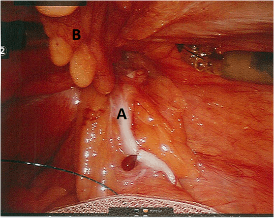 A 40-year-old male presented to the outpatient surgery clinic with a right sided scrotal mass which was present since childhood. Patient admitted that it progressively become enlarged but never became firm, irreducible, erythematous, or exquisitely painful. He denied changes in bowel habits, nausea, vomiting, fever, or chills. He did, however, complain that he could feel his bladder "slip into the swelling" on occasion which caused him difficulty in urination. This was not associated with any dysuria, pyuria, or hematuria. The patient had a past medical history significant for obstructive sleep apnea on a CPAP machine at home, obesity, and borderline hypertension. His only surgical history was a childhood tonsillectomy. He was not on any medications and has allergies to penicillin. He denied smoking or drinking but admitted to occasional marijuana use approximately once every two weeks. On physical examination, he presented with a reducible right inguinal hernia extending into his scrotum. There was no erythema or tenderness. The testicles were present in the scrotal sacs bilaterally. The patient was scheduled for an elective robotic assisted laparoscopic right inguinal hernia repair with mesh, possible bilaterally, in the ambulatory setting. Preoperative labs were within normal limits. Standard antiseptic technique was used to prep the patient and a total of three port site incisions were made for the da Vinci robot arms to dock and enter. The patient was placed in trendelenburg position and a robotic 8-mm trocars were placed in each anterior axillary line and a 30-degree camera was placed in the up position in the umbilical port. The robot was docked in the standard fashion. The right inguinal region was visualized and incarcerated inguinal hernia was noted. Once hernia contents reduced, a non-inflamed appendix and portion of the cecum was seen in the hernia sac. Type 1 Losanoff and Basson classification Amyand hernia was noted (Figure 1) and (Figure 2). The appendix, cecum, and pericolonic fat were reduced into the abdomen and the peritoneum was scored from the medial umbilical fold laterally to the anterior superior iliac spine. A preperitoneal flap was created by dissecting the peritoneum away from the spermatic cord vas deferens anteriorly with the hook electrocautery. A 3D max mesh and a 6-inch V-Loc suture were introduced intraperitoneally under direct visualization. The mesh was used to cover the preperitoneal space overlying the direct and indirect inguinal spaces. No direct hernia was observed. The indirect space and rest of the potential hernia sites were covered with mesh with adequate coverage. The mesh was tucked into the small peritoneal pocket and appeared secure without evidence of migration. The peritoneal flap was closed with a running 6-inch V-Loc suture. Patient was extubated in the OR and discharged home the same day after a non-complicated postoperative course. | ||||||