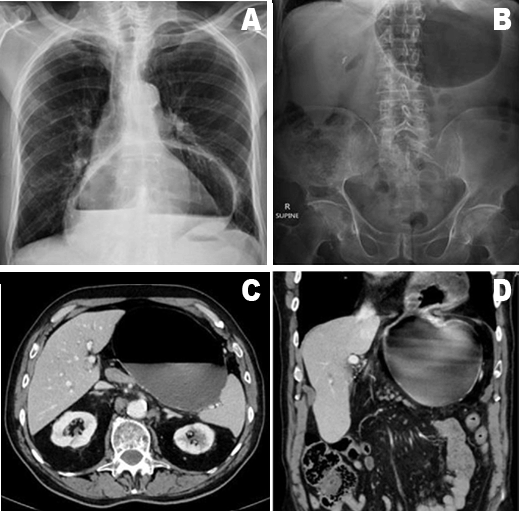 Gastric volvulus is a recognized complication of hiatal hernia and is characterized by abnormal rotation of the stomach by more than 180° resulting in a luminal obstruction [1]. Gastric volvulus is a rare disease with an unknown incidence primarily because the condition can occur in an acute or chronic variant [2]. Considered a surgical emergency, gastric volvulus has a non-operative mortality rate potentially as high as 80% [1] [3]. Type I or organo-axial gastric volvulus accounts for 60% of gastric volvulus and is characterized by the stomach rotating around its long axis [1]. Type II or mesenterioaxial volvulus occurs with rotation of the stomach along an axis perpendicular to its longitudinal axis [3]. In Type II volvulus, the stomach typically lies in a vertical plane, with the antrum and pylorus rotated anterior and superior to the gastroesophageal junction [3]. Almost 30% of cases are Type II gastric volvulus [2]. Rotation of the stomach about both the organoaxial and mesenterioaxial axes is a Type III or "combined volvulus" [1]. Type III volvulus is extremely rare, potentially only comprising 12% of all cases of gastric volvulus [2]. Due to its rarity, the presentation and management options of particularly Type III gastric volvulus is not well described in literature. | ||||||