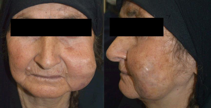 Accessory parotid gland tumors are masses within salivary gland tissue located adjacent to Stensen duct, but separate from the main body of the parotid gland in approximately 21–61% of the population [1].They have their own blood supply from the transverse facial artery with secondary duct emptying into the Stensen duct [2]. This glandular tissue was considered to be only an extension of the main parotid gland, but now it is known to be independent structure have their function and anatomic location [3]. They form 1–7.7% of all the parotid gland tumors [4] [5]. Masses arising in the mid-cheek region may often be overlooked as a rare accessory lobe parotid neoplasm [6]. The main parotid glands (18–20%) are malignant tumors but a higher rate of malignancy seen in the glandular tissues (accessory part) reach (26–50%) [2]. This higher rate of malignancy is attributable to the histology of this gland. As in the submandibular gland, the accessory parotid gland made up of an equal percentage of mucinous and serous acinar units, in contrast to the main parotid gland in which the serous units are predominant [3]. Easy tumor extension predisposes these tumors to significant soft-tissue infiltration due to the lack of anatomic barriers [6]. Here we describe a case of acinic cell carcinoma of an accessory parotid gland. Can be approached through of two incisions as surgical treatment for this tumor either mid-cheek incision or standard modified Blair's incision. Higher incidence of facial nerve branch damage by mid-cheek incision [6]. | ||||||