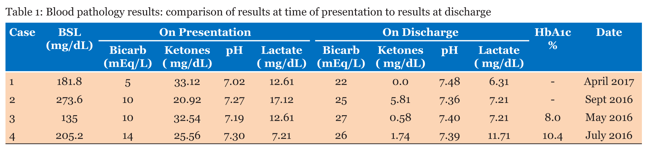 Sodium-glucose co-transporter 2 (SGLT2) inhibitors are a new class of oral hypoglycemics. The commonly used drugs in this class in Australia are dapagliflozin, canagliflozin and empagliflozin. In addition to serum glucose control, their cardioprotective, renoprotective, blood pressure control and weight loss benefits have led to increasing the use of drug in the community. A significant adverse effect that has been reported is euglycemic ketoacidosis. This is of particular significance to surgeons as the combination of long periods of fasting, surgical stress and reduced insulin dosing in acute surgical patients increases their risk of developing euglycaemic ketoacidosis [1][2][3] [4][5][6]. This report presents four acute surgical patients who developed euglycaemic ketoacidosis and explores the importance of early recognition of the condition by surgical teams. | ||||||