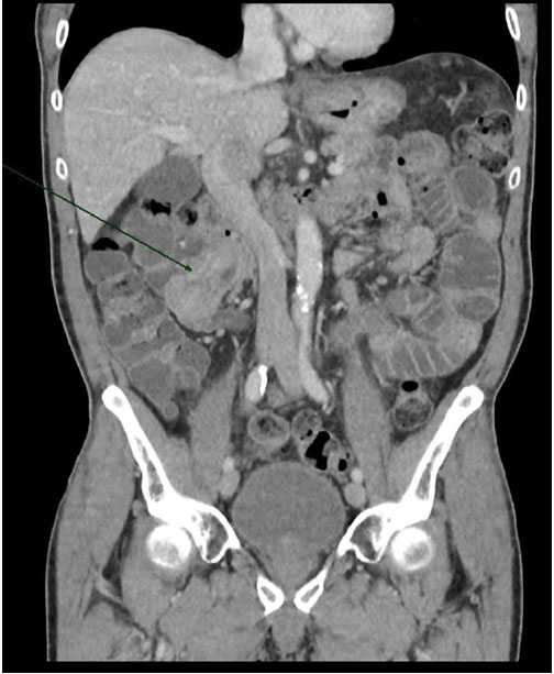 His abdominal examination revealed localized sign of peritonism. Apart from raised serum lactate 2.45 mmol/L and deranged LFT with ALT 174 U/L and AST 221 U/L, the rest of the blood results were within normal limit. Computed tomography scan of abdomen and pelvis demonstrated an enteroenteric intussusception in the right mid abdomen resulting in partial bowel obstruction with mild dilated loops of proximal small bowel (Refer Figure 1 and Figure 2). There were no evidence of perforation. No mass lesion was clearly identified within the bowel; however, an incidentaloma in the right adrenal gland was found, measuring 48 × 62 mm. The liver, gallbladder, pancreas, spleen, and both kidneys were unremarkable. There was no periaortic or mesenteric lymphadenopathy noted.