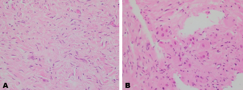 Given its asymptomatic nature and lack of specific diagnostic methods, imageology plays an important role in this diagnosing disease. Computed tomography, ultrasound, and magnetic resonance imaging show a well-circumscribed, oval, lobulated mass. Ultrasound reveals a homogenous, hypoechoic, mass while an unenhanced CT will show a low attenuation, homogenous mass. Calcifications are seen in about 20% of cases [6]. Ganglioneuromas tend to surround or displace major blood vessels but do not cause occlusion or compression [1]. There are no specific radiological findings for GN tumors making differentiation from other tumors difficult and often only possible with histological examination of the resected mass postoperatively. Cellular atypia, mitotic activity, and necrosis are not observed on histopathological examination [8]. Definitive diagnosis is confirmed after pathological examination of the specimen.