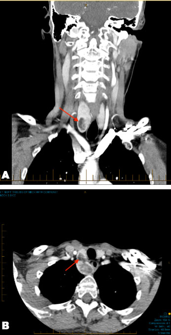 A 58-year-old asymptomatic Caucasian female was referred to the General Surgery clinic for review of two non-tender right-sided thyroid nodules, of unknown duration, which were incidentally discovered on plain film spine X-ray following a spinal fracture. Computed tomography (CT) of the neck demonstrated a goitrous nodule within the right lobe of the thyroid with no retrosternal extension, but with impingement and mild displacement of the trachea and esophagus (Figure 1). The patient had no history of thyroid disorders or irradiation, no significant family history of thyroid cancer or disease, and no history of autoimmune disease. Physical examination demonstrated a mildly enlarged thyroid with no palpable nodules, negative for Pemberton’s sign, without palpable cervical lymphadenopathy, and normal laryngeal motility.