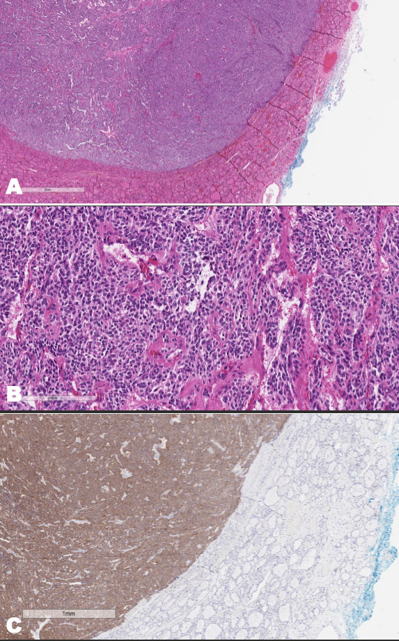 Immunohistochemistry was performed on lesion 1. The tumor was positive for neuroendocrine markers synaptophysin and CD56, and weakly positive for chromogranin. It was negative for cytokeratin (AE1/3), calcitonin, C-Kit, and CD5. The Ki67 index was less than 1%.