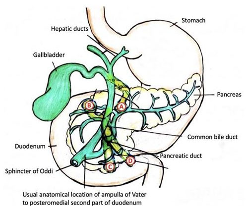 The hepatopancreatic ampulla of Vater is located at the posteromedial wall of the second part of duodenum (D2). Ectopic ampulla of Vater (EAV) is the confluence of common bile duct (CBD) and main pancreatic duct where there is no usual papillary opening in the posteromedial wall of D2 but instead may arise at the duodenal bulb, and less commonly into third (D3) and fourth (D4) parts of the duodenum, or parts of the stomach [1],[2] (Figure 1). Ectopic ampulla of Vater may cause upper abdominal pain, choledocholithiasis, ascending cholangitis, and acute pancreatitis. As bile drains proximally, duodenal ulceration and stenosis near the opening may develop [2]. Periampullary carcinoma in association with EAV to D4 has also been reported [3].