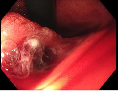 He presented to his local hospital two months later with melena and severe anemia after non-adherence to proton pump inhibitor therapy and was transferred to a tertiary referral center [hemoglobin was 69 g/L (130–180 g/L) from 99 g/L on discharge]. Endoscopy this time revealed active bleeding from the ulcer within the hiatus hernia. Hemostasis was achieved by thermal therapy to the ulcer base. Biopsy of the ulcer could not be obtained during both procedures, given the acuity of his presentations. He has since been discharged on twice daily oral proton pump inhibitor therapy with planned surveillance gastroscopy within the next four months.