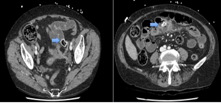 Paramedics reported hematemesis and tachycardia during hospital transfer and he received 1 L of sodium chloride 0.9% resuscitation. In the emergency department, he had ongoing hematemesis prompting activation of massive transfusion protocol due to ongoing hemorrhage, hemodynamic instability (HR 125, BP 118/84), and anticipated transfusion of >50% total blood volume in 4 hours. Furthermore, he was treated with high dose proton pump inhibitor infusion and informed consent was given for upper gastrointestinal endoscopy, with a view to proceed for laparotomy if endoscopic hemostasis failed.