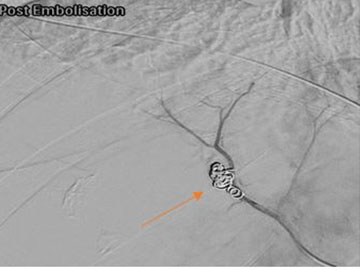 Angiography confirmed the presence of a pseudo-aneurysm in the distal segmental branch of the right hepatic artery, subsequently embolized using micro coils (Figure 3). Post-embolization angiography exhibited complete occlusion of the aneurysm and its feeding vessel, while sparing the segmental vessels (Figure 4). After four days in the ICU, the patient was transferred to the ward for continued antibiotic therapy due to escalating inflammatory markers and persistent pyrexia. A follow-up portal venous CT scan revealed unchanged coil positions, along with infarcts in segments 7 and 8 of the right liver lobe, indicative of ongoing pancreatitis. Subsequent imaging over a two-week period demonstrated a reduction in hemoperitoneum, evolving hematoma density, and transformation of hepatic infarcts into an abscess. Adjustments to the antibiotic regimen were made based on sensitivity results and consultations with a microbiologist. The case was reviewed by the Hepato-Pancreato-Biliary (HPB) team at a specialized center, resulting in the addition of antifungal therapy. The patient remained under ward care, receiving antibiotics, intravenous fluids, and analgesics for a suspected liver abscess, presumed to have arisen from liver infarction. Following the establishment of a follow-up plan, the patient was discharged home. It is noteworthy that the infarction likely began early after the bleeding episode, as pre-embolization CT scans displayed ill-defined hypo-attenuated areas within the segments of the right hepatic lobe. These areas were attributed to hypoperfusion secondary to compromised flow in the distal sub-segmental branches of the right hepatic artery. Subsequent imaging showed the evolution and clarification of the infarct over time.