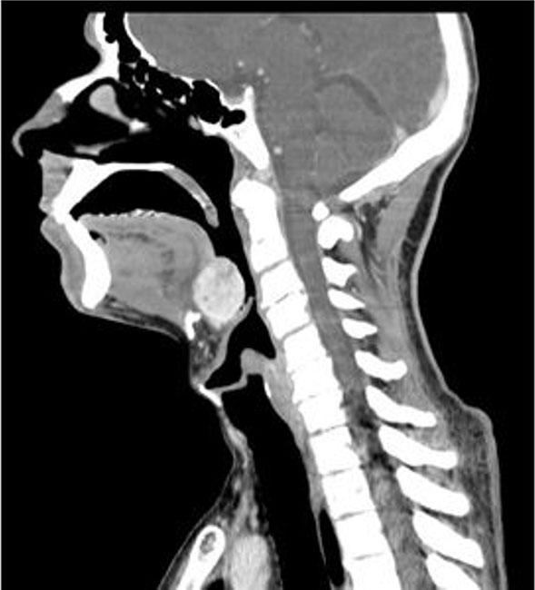 Computed tomography scan documented a non-homogeneously hyperdense structure with an oval morphology of 25 mm with a craniocaudal extension of 29 mm that is located behind the base of the tongue and above the hyoid bone and the epiglottis with which it contracts continuity. No thyroid was appreciable in its normal anatomical location (Figure 2).