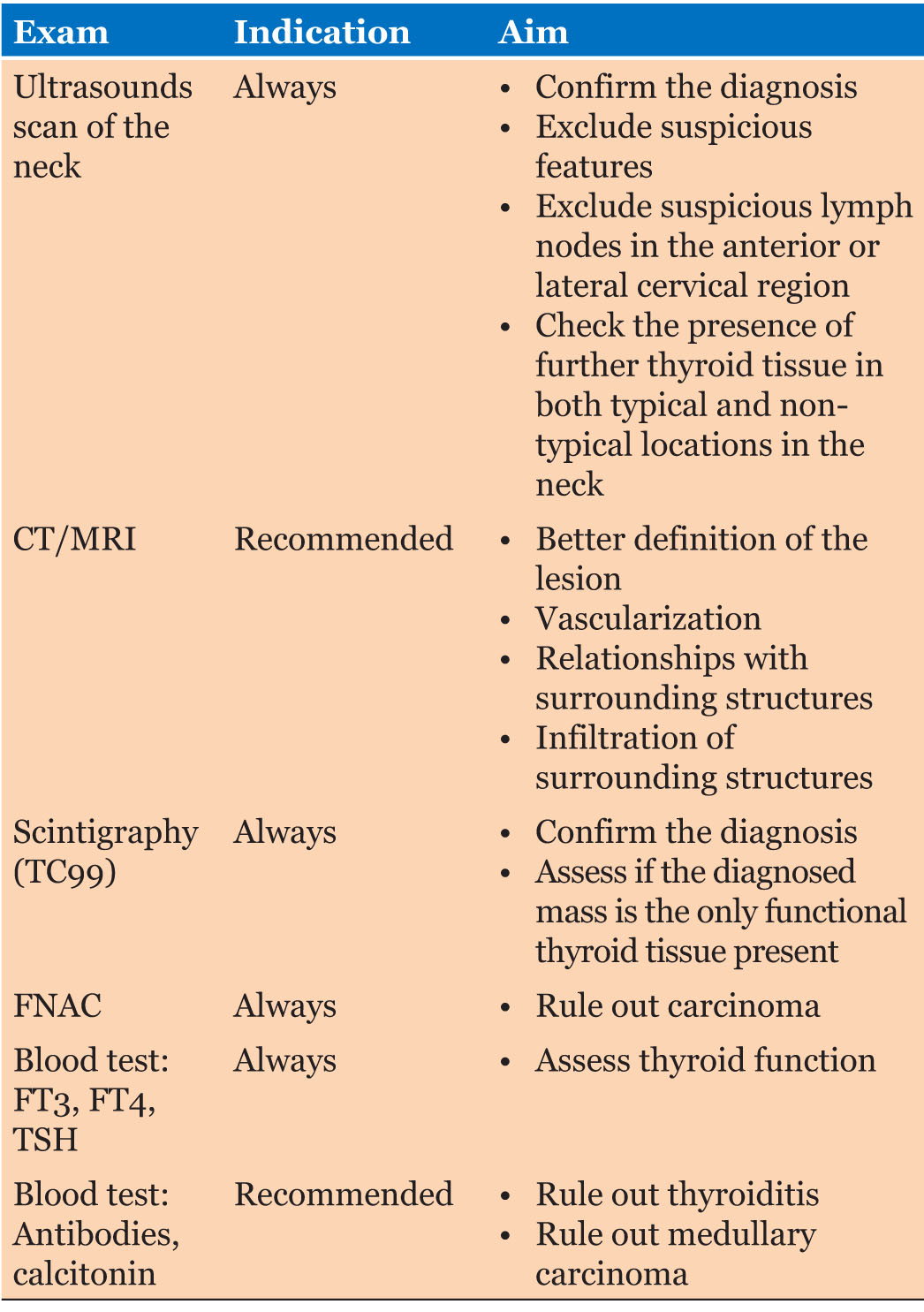 After literature review [4],[5],[6],[22],[24],[26], our attitude is that in case of suspected diagnosis of LT, at least an ultrasound (US) of the neck must be performed. Ultrasound may exclude suspicious features, the presence of suspicious lymph nodes in the anterior or lateral cervical region, and the presence of further thyroid tissue in both typical and non-typical locations in the neck. We recommend to perform second level exams like CT scan or MR for a better definition of the lesion in terms of vascularization, relationships with surrounding structures, and to exclude any infiltration of these structures. Thyroid scintigraphy is necessary to confirm the LT diagnosis and to assess if the diagnosed mass is the only functional thyroid tissue present. The assessment of thyroid function is necessary for decision-making treatment after diagnosis. We suggest to perform TSH, FT3, and FT4 blood test and to dose circulating antibodies to thyroid antigens (mainly thyro-peroxidase and thyroglobulin) and calcitonin, in order to rule out thyroiditis or rare carcinoma. As we previously described, the onset of thyroid carcinoma is rare, but the diagnosis of malignancy could be challenging. In 2001, Massine et al. [27] affirmed that fewer than 30 cases of LT carcinoma had been reported in the literature. A more recent review performed by Vincent et al. [26] reports less than 60 cases of LT carcinoma published so far. These patients commonly present with symptoms (dyspnea, dysphagia, voice alteration, or bleeding). As in the normal thyroid, the most frequent histology subtype is papillary. Thus, LT carcinoma can be treated similarly to usual thyroid carcinoma, with optimal results after surgery and following RAI ablation, when necessary. Anyway, considering that the differential diagnosis between benign and malignant LT can be very challenging, either clinically and radiographically, we recommend FNAC determination of the lesion in any case of LT. Fine needle aspiration may give an inconclusive or non-diagnostic result. However, according to the literature [4],[5],[28],[29], as well as in our opinion, it may instead provide a valid support to drive the subsequent therapeutic decision. Our proposed diagnostic management is summarized in Table 1.