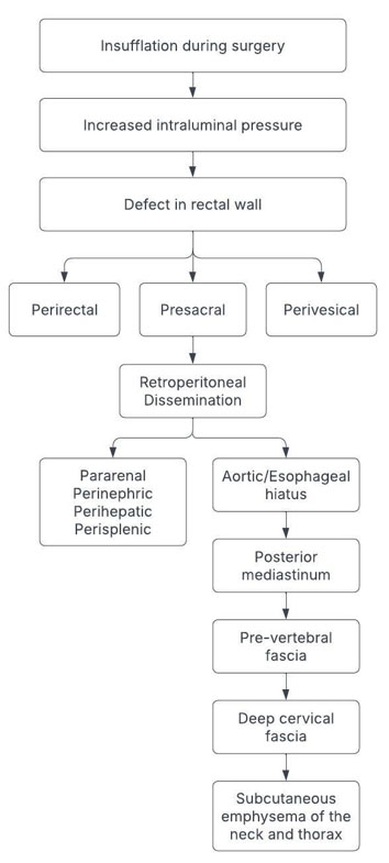 The mechanisms underlying these complications are thought to involve insufflation pressures during surgery, leading to air diffusion along tissue planes. The complete dissemination route is illustrated in Figure 1. During transanal excision, insufflation of CO2 or room air into the rectal lumen is used to enhance visualization, increasing intraluminal pressure. Pressure can force air into adjacent tissue planes during full-thickness resection. Even without a peritoneal breach, air may escape and follow natural anatomical pathways. It accumulates in the perirectal space, then spreads posteriorly to the presacral space and anteriorly to the perivesical region. Air may then ascend through retroperitoneal fascial planes, reaching the perihepatic, perisplenic, pararenal, and perinephric areas. It tracks into the posterior mediastinum via the aortic or esophageal hiatus, dissecting cranially along major vascular structures. From the mediastinum, air moves superiorly through the prevertebral fascial planes and disseminates along the deep cervical fascia. This results in subcutaneous emphysema of the neck and thorax, with potential extension to the face and scalp in more severe cases. While radiologically striking, these patterns usually resolve with antibiotics, monitoring, and supportive care. Surgery is only necessary if clinical deterioration or peritonitis occurs.