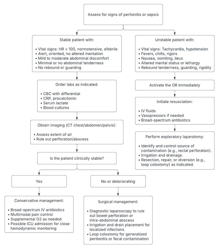 Management of pneumoperitoneum and subcutaneous emphysema following transanal excision is largely dictated by the patient’s clinical stability. Patients who are hemodynamically stable, without signs of peritonitis or systemic infection, and who have reassuring labs and imaging, can be safely managed with intravenous antibiotics, supportive care, and close monitoring. However, the presence of hemodynamic instability, fever, leukocytosis, elevated lactate, or imaging findings suggestive of bowel perforation or abscess warrants immediate surgical evaluation. Operative intervention may involve diagnostic laparoscopy, repair of a defect, drainage of localized infection, or fecal diversion if contamination is extensive. This stepwise clinical decision-making process is outlined in Figure 4, which serves as a practical reference for triaging patients with these rare but potentially serious postoperative complications. Prompt recognition and appropriate escalation are critical to optimizing outcomes while avoiding unnecessary surgical intervention.