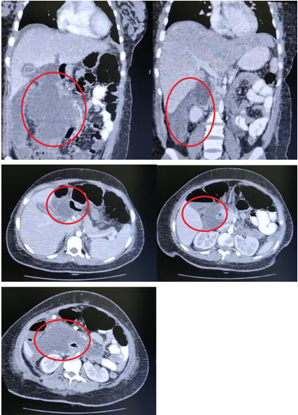 The patient continued to experience abdominal pain in the postoperative period. She presented with persistent tachycardia and a greenish-yellow fluid in the drainage, prompting an abdominal tomography on the second day after surgery (Figure 1), revealing free fluid and collections between the intestinal loops without hepatic lesions or other alterations. The surgeons decided to perform another laparotomy, revealing biliary peritonitis of the four quadrants without alterations in the gallbladder or bile duct. The intestine was intact; however, bile seemed to originate from the hepatic hilum with no apparent source. Subsequently, a subhepatic drainage was inserted, and the patient was transferred to a higher care hospital for further diagnostic workup.