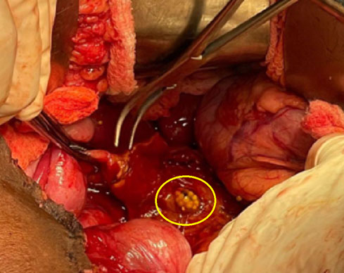 The patient arrived at the quaternary care hospital in poor condition, tachycardic, with fever, and signs of peritoneal irritation. Liver function was normal, with a C-reactive protein of 7.7 mg/dL, leukocytes of 10,700 mm3, and platelets of 512,000 mm3. An urgent exploratory laparotomy was planned due to suspected duodenal perforation. The surgery revealed free serous intrabdominal fluid, adhesions of the small intestine to the pelvis, a long appendiceal stump, inflammatory changes in the right retroperitoneum, and distal CBD necrosis with a secondary perforation due to an embedded gallstone, as observed in Figure 2. The gallbladder had a normal macroscopic aspect. Drainage of the peritonitis and release of the right colon through Toldt’s line and Kocher’s maneuver were performed to achieve adequate exposure of the duodenum and hepatic hilum, which showed a significant inflammatory process. Support from hepatobiliary surgery was requested during the intraoperative period, and a careful cholecystectomy was performed. Due to the condition of the bile duct, it was not possible to perform a primary raffia or management with a T-tube. Therefore, a distal bile duct resection and reconstruction with Roux-en-Y hepaticojejunostomy were opted for.